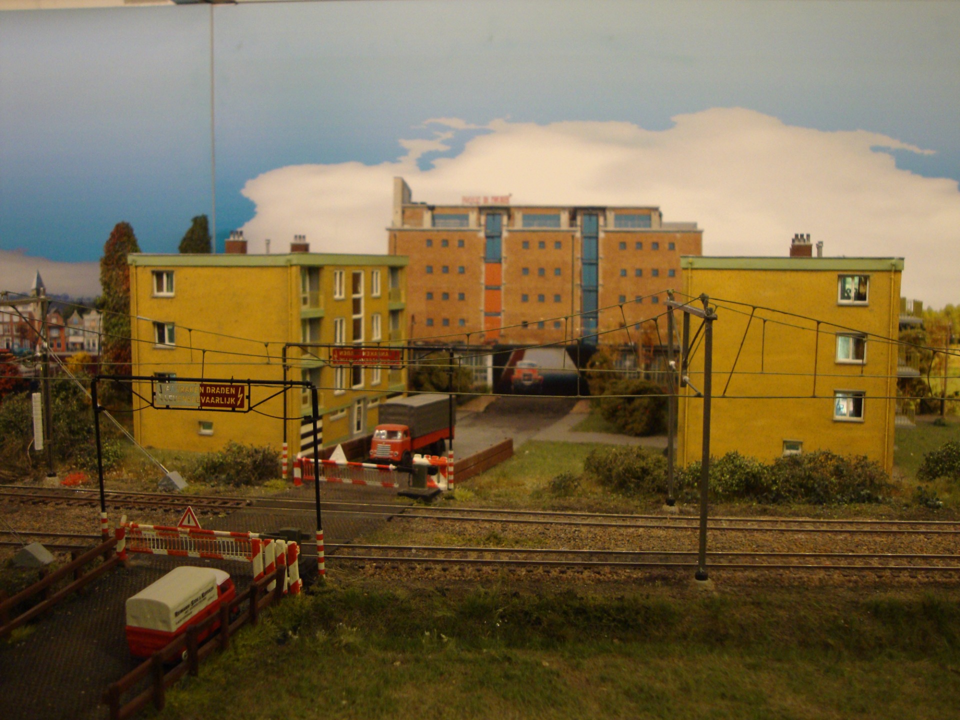 Langs de doorgaande weg zijn in de wederopbouwtijd deze twee portiekflats gebouwd. Hoewel ze ook nu nog op diverse plaatsen in Nederland te vinden zijn, blijken ze in steeds mindere mate aan de huidige wooneisen te voldoen en is hun lot vaak bezegeld, maar in de jaren '50 was men hier heel blij mee. Het gebouw op de achtergrond zal door velen als Pakhuis de Zwijger uit Amsterdam worden herkend. De overweg op de voorgrond is nog van de oude, handmatig bediende, spoorbomen voorzien, een grote hindernis voor het toen steeds drukker wordende verkeer.