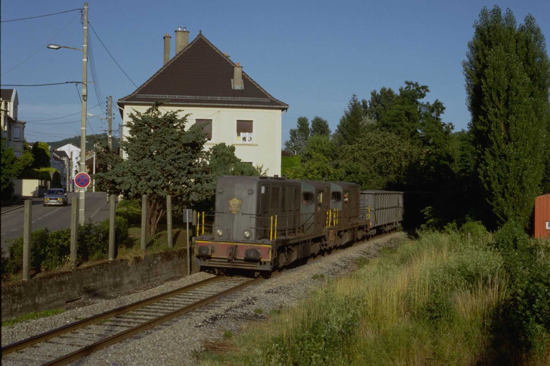 Locomotieven BB07 en BB06 van de HBL met een trein voor het vervoer van afgegraven materiaal van slakkenbergen, waarmee de gangen van zojuist gesloten mijnen in noordoost Frankrijk worden gevuld. Wanneer de locs van dit type van de HBL in voorspan reden, werden ze met de korte huiven naar elkaar toe gekoppeld. Dit had te maken met de plaats van de accu's. Het motorvermogen van deze locs was afgesteld op 600 pk; de maximum toegestane snelheid bedroeg 50 km/uur. Bij de 2400'en van de NS was dit respectievelijk 850 pk en 80 km/uur. Freyming-Merlebach 10-07-1999.