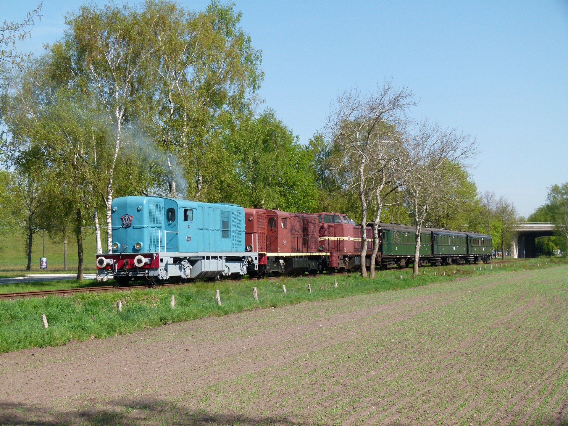 NS 2400'en in voorspan. Op de lijn van de VSM bij Apeldoorn reed op 7 mei 2016 deze fototrein. De inmiddels weer blauwe 2412 met de roodbruine 2459 en 2530 trekken een drietal Blokkendoosrijtuigen. De 2412 is een van de locomotieven die in Frankrijk heeft gediend voor de aanleg van TGV-lijnen. Na deze periode, waar de machine onder het nummer SNCF 662412 heeft gereden, is hij naar Nederland teruggehaald en zoveel mogelijk in afleveringstoestand teruggebracht. Helemaal juist is het plaatje niet, want een blauwe 2400 en roodbruine 2530 hebben nooit tegelijkertijd bij NS dienstgedaan. De laatste blauwe 2400 is in 1956 roodbruin geworden; de oorspronkelijk lilakleurige 2530 werd in 1963 roodbruin. Te Bilthaven zijn 2400'en in deze kleurstellingen echter ook te vinden.