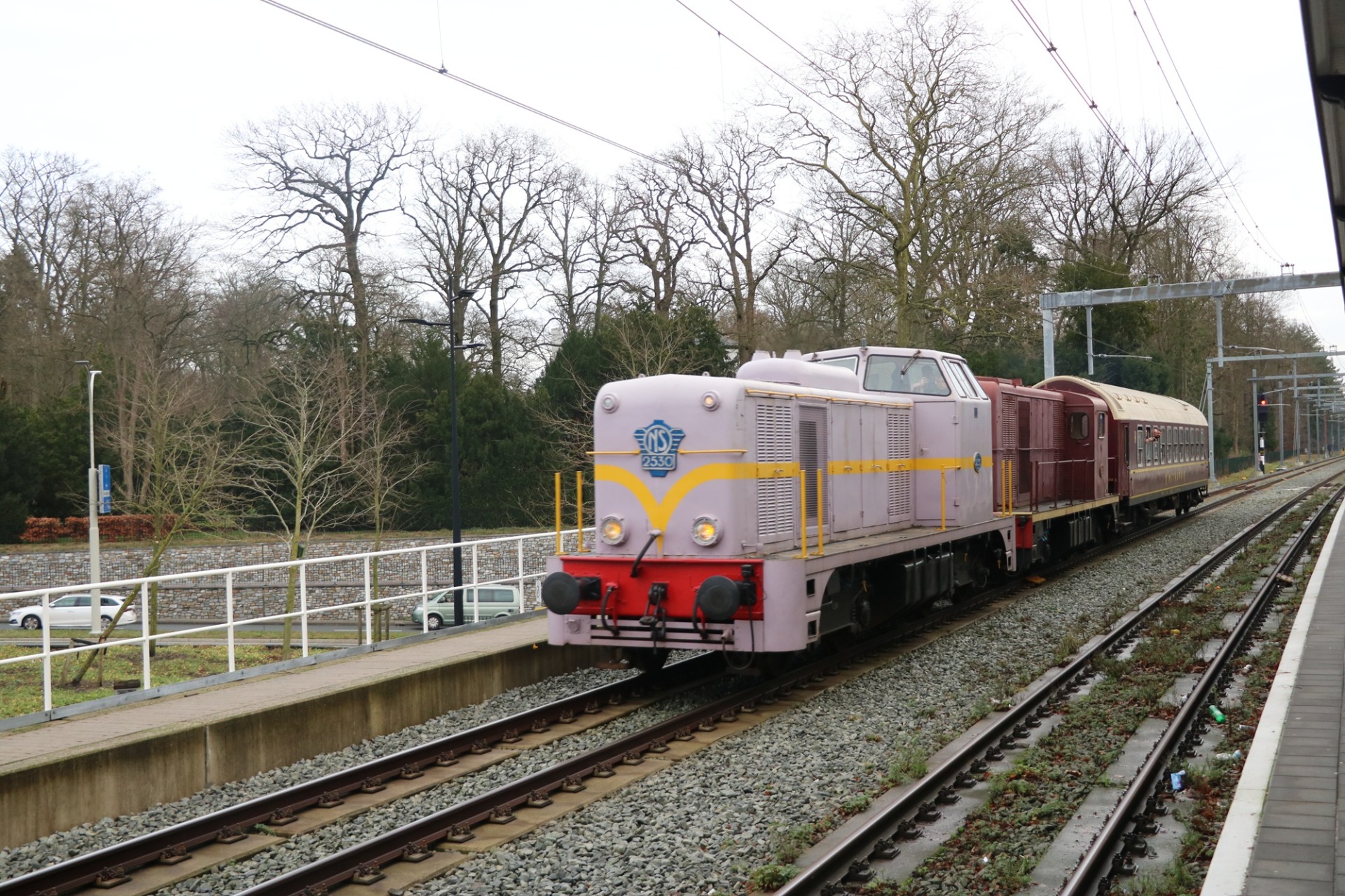 Loc 2530 in de oorspronkelijke uitvoering. Sinds enkele jaren is de 2530 van de VSM weer in de oorspronkelijke lila-kleurstelling teruggebracht. Hier is de loc samen met de roodbruine 2459 en een Mitropa-rijtuig onderweg van Beekbergen naar de SSN te Rotterdam om een daar eerder gestrand Blokkendoosrijtuig (warmloper) op te halen. Driebergen-Zeist 30-12-2023.