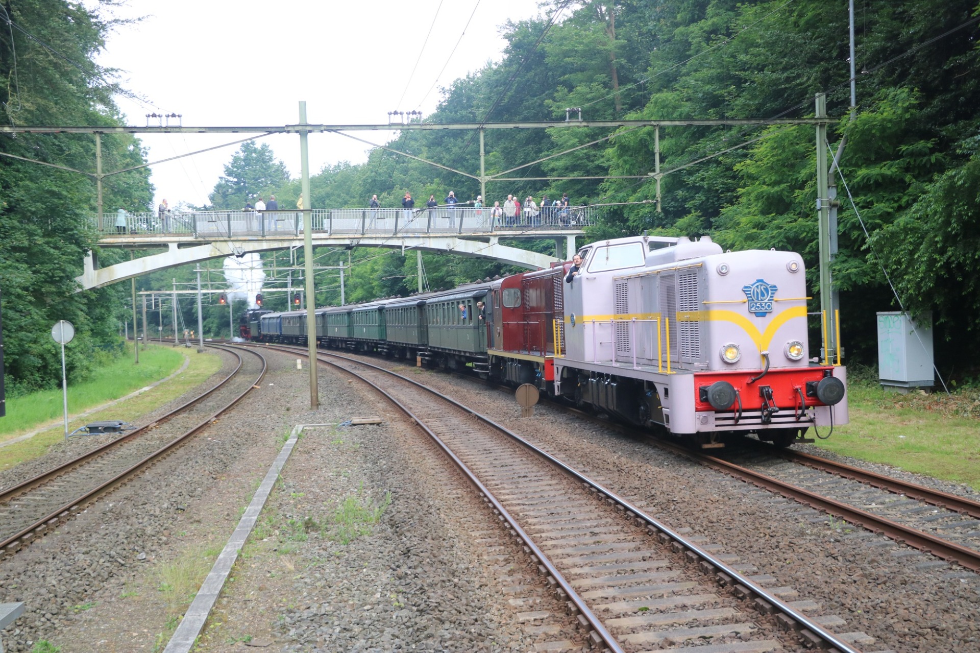 De locomotieven 2530 (in oorspronkelijke kleurstelling) en 2459 van de VSM rijden vanaf Hilversum station Baarn binnen op Spoor 1. Het betreft hier de Oosterspoor Express, een speciale trein die reed ter gelegenheid van 150 jaar Oosterspoorweg, 150 jaar station Baarn en 600 jaar Hilversum. De trein bestaat behalve uit de reeds genoemde locs uit zes Blokkendozen, Stalen D 7614 en loc DB 23.076, alle van de VSM. We schrijven 08-06-2024.