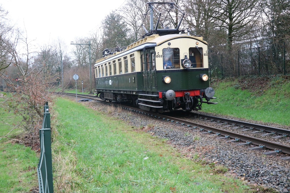 Blokkendoosmotorwagen mC 9002 'Jaap' tijdens de Oliebollenrit van de NVBS gefotografeerd op de Stichtse lijn tussen Soest en Soestdijk op 30 december 2023. Deze blokkendoos uit 1924 is weer zoveel mogelijk in de afleveringstoestand teruggebracht en daarbij dus gestoken in de groen-crême-kleurstelling, een mooi voorbeeld voor de eveneens in deze uitvoering rijdende driedelige stam te Bilthaven.