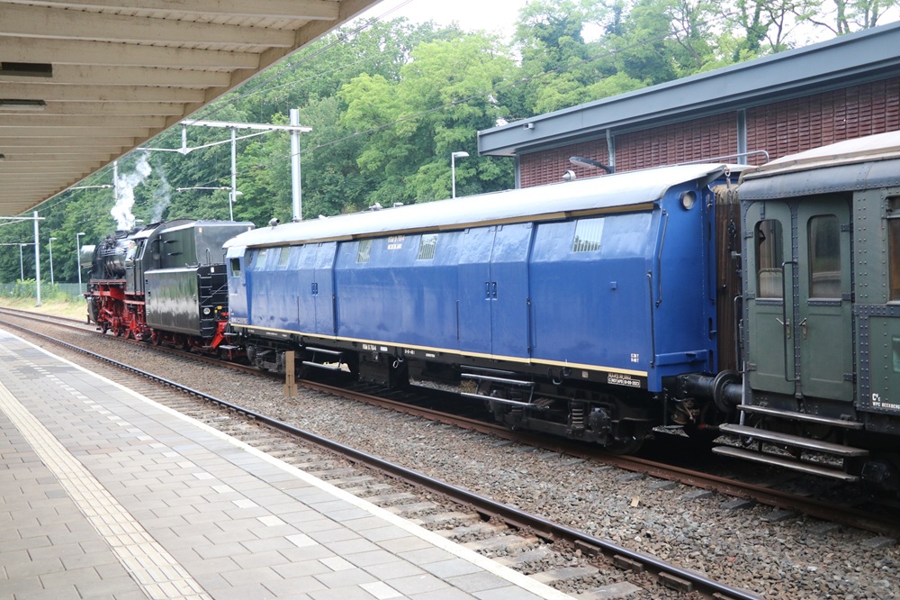 Stalen D 7614 kwam na haar actieve leven bij de VSM terecht en staat keurig gerestaureerd achter loc 23.076 gereed om, opgenomen in de Oosterspoorweg-Express, naar Hilversum te vertrekken. Omdat deze Stalen D ook ingezet werd in de Holand-Scandinavië Express heeft deze Stalen D ogen om op veerboten te kunnen worden vastgezet. Baarn (Spoor 1) 08-06-2024.