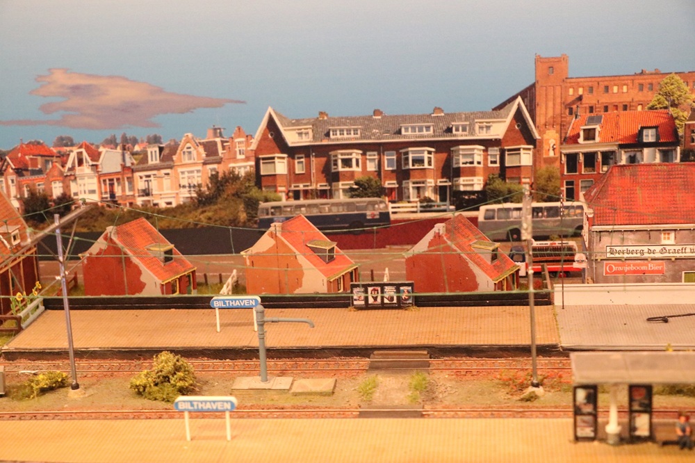 Deel van het station met perrons en de achterliggende bebouwing. In het midden een drietal historische arbeiderswoningen. Rechts een deel van café en herberg `De Graeff van Bilthaven`. Op de perrons uiteraard de bekende historische reclameaffiches.